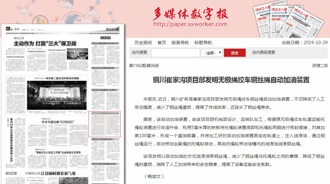 本報(bào)訊 近日,銅川礦務(wù)局崔家溝項(xiàng)目部發(fā)明無(wú)極繩絞車鋼絲繩自動(dòng)加油裝置,不僅降低了人工勞動(dòng)強(qiáng)度,減少了鋼絲繩磨損,提高了抹油效率,還延長(zhǎng)了鋼絲繩壽命。