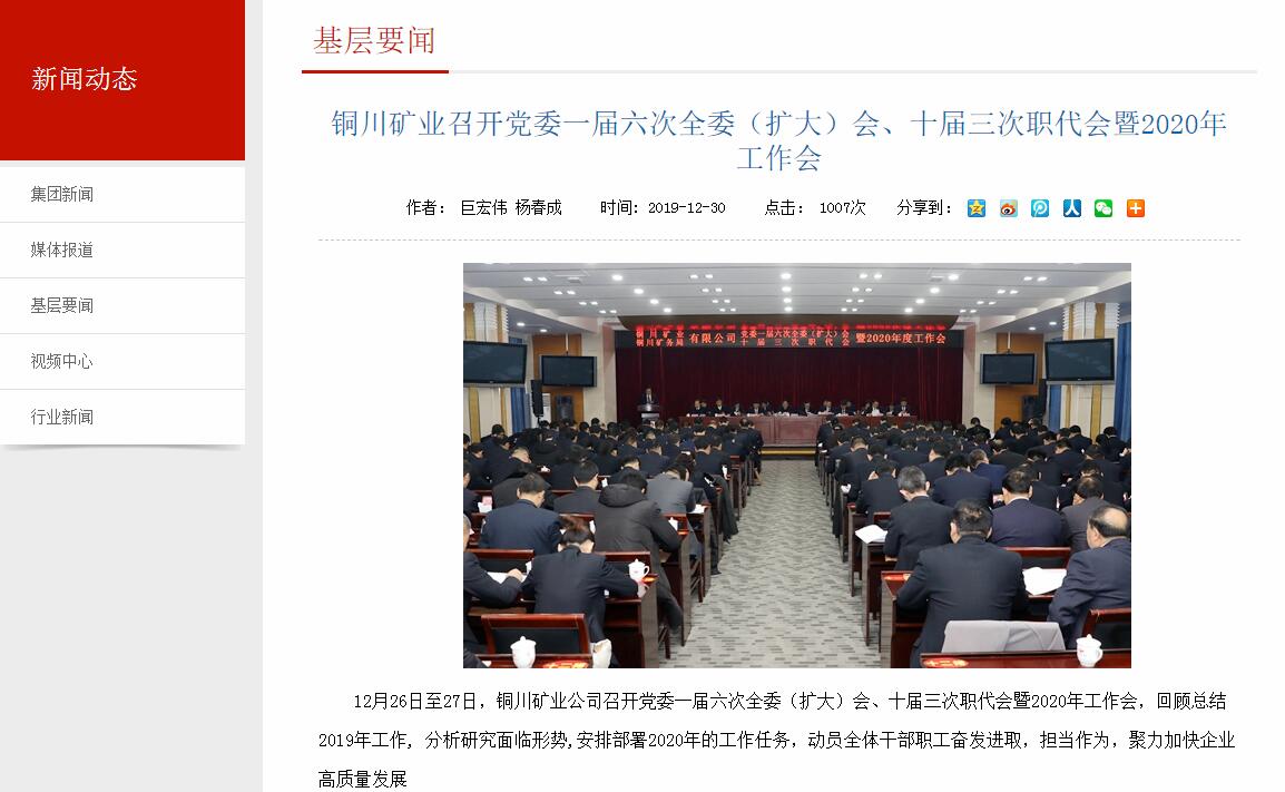 12月26日至27日,銅川礦業(yè)公司召開黨委一屆六次全委(擴(kuò)大)會(huì)、十屆三次職代會(huì)暨2020年工作會(huì),回顧總結(jié)2019年工作, 分析研究面臨形勢,安排部署2020年的工作任務(wù),動(dòng)員全體干部職工奮發(fā)進(jìn)取,擔(dān)當(dāng)作為,聚力加快企業(yè)高質(zhì)量發(fā)展