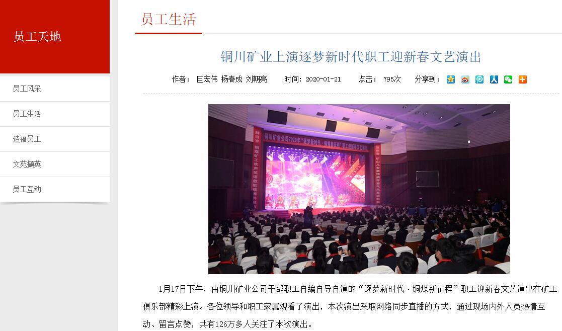 1月17日下午,由銅川礦業(yè)公司干部職工自編自導(dǎo)自演的“逐夢新時代·銅煤新征程”職工迎新春文藝演出在礦工俱樂部精彩上演。各位領(lǐng)導(dǎo)和職工家屬觀看了演出,本次演出采取網(wǎng)絡(luò)同步直播的方式,通過現(xiàn)場內(nèi)外人員熱情互動、留言點(diǎn)贊,共有126萬多人關(guān)注了本次演出。