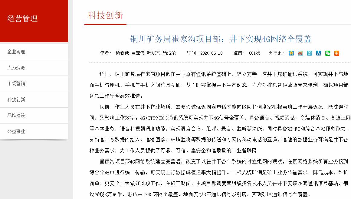 銅川礦務(wù)局崔家溝項(xiàng)目部:井下實(shí)現(xiàn)4G網(wǎng)絡(luò)全覆蓋
