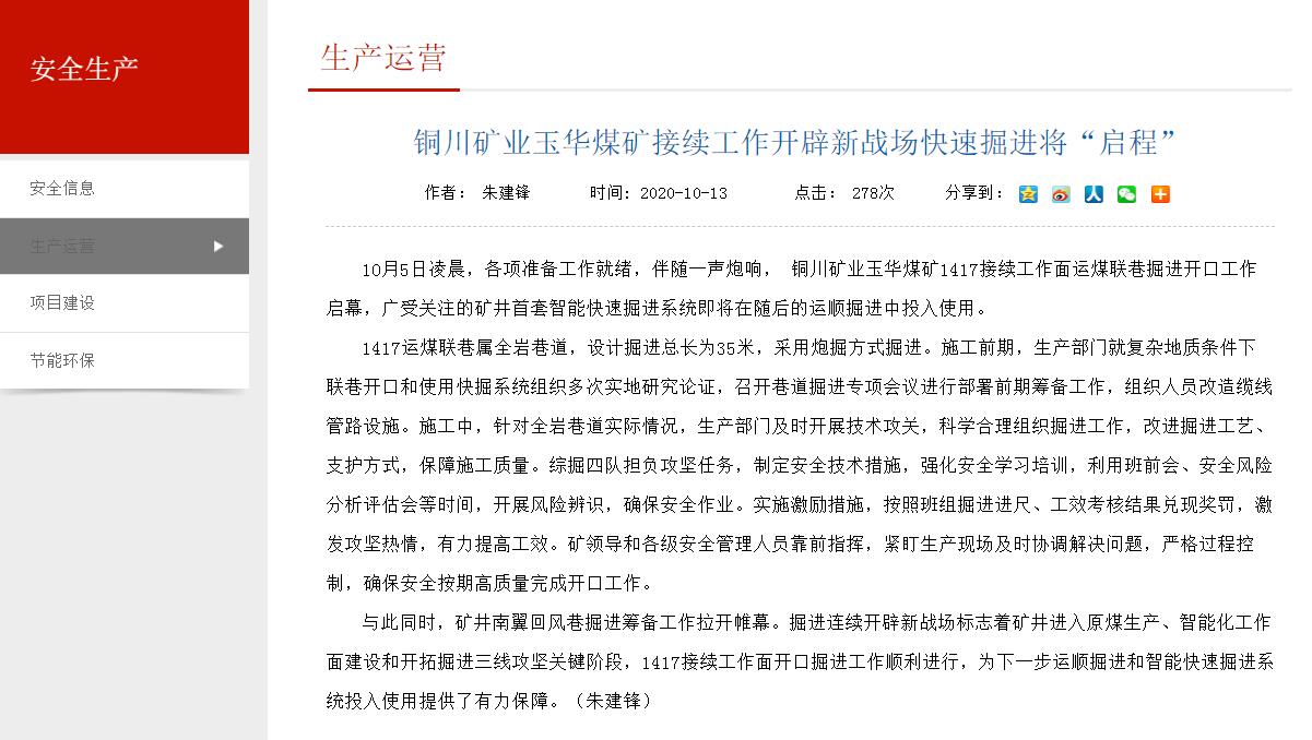10月5日凌晨,各項(xiàng)準(zhǔn)備工作就緒,伴隨一聲炮響, 銅川礦業(yè)玉華煤礦1417接續(xù)工作面運(yùn)煤聯(lián)巷掘進(jìn)開口工作啟幕,廣受關(guān)注的礦井首套智能快速掘進(jìn)系統(tǒng)即將在隨后的運(yùn)順掘進(jìn)中投入使用。