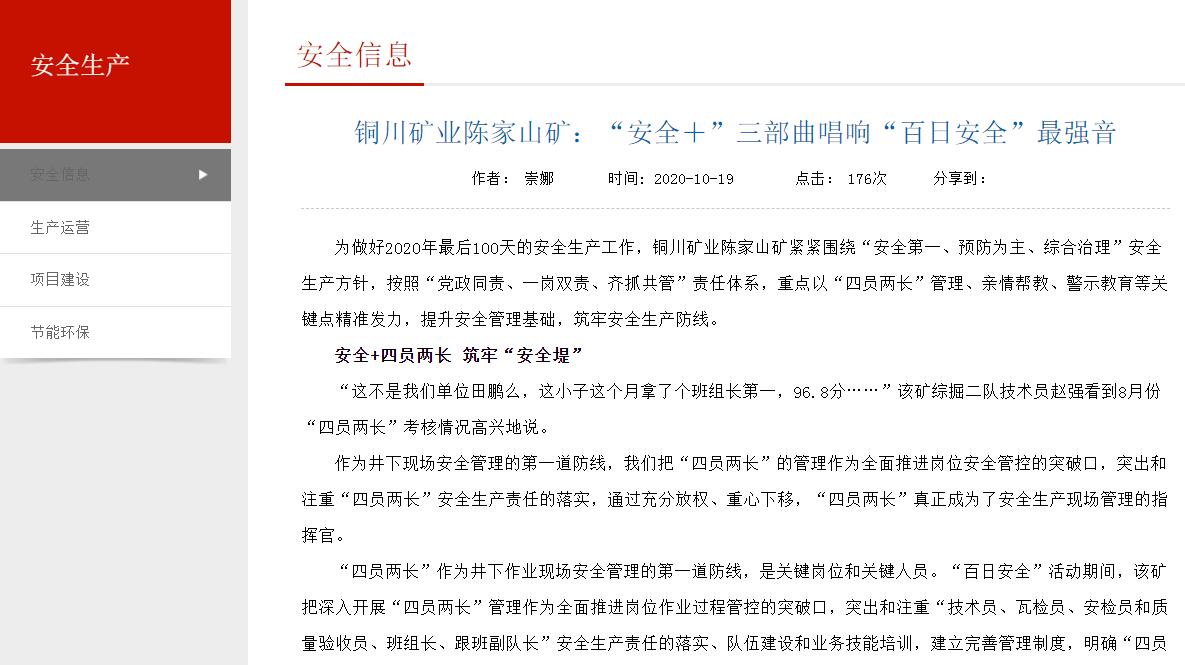 為做好2020年最后100天的安全生產工作,銅川礦業(yè)陳家山礦緊緊圍繞“安全第一、預防為主、綜合治理”安全生產方針,按照“黨政同責、一崗雙責、齊抓共管”責任體系,重點以“四員兩長”管理、親情幫教、警示教育等關鍵點精準發(fā)力,提升安全管理基礎,筑牢安全生產防線。