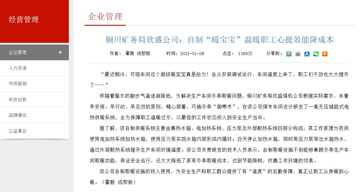 伴隨著隆冬的腳步氣溫逐漸降低,為解決生產(chǎn)車間冬季取暖問(wèn)題,銅川礦務(wù)局欣盛煤機(jī)公司根據(jù)實(shí)際需求,本著早安排、早行動(dòng)、早見(jiàn)效的原則,精心部署,巧施冬季“御寒術(shù)”,在該公司煤專車間設(shè)計(jì)研發(fā)了一套無(wú)壓儲(chǔ)能式電熱供暖系統(tǒng),全力保障職工溫暖過(guò)冬,以最佳的工作狀態(tài)投入到安全生產(chǎn)當(dāng)中。
