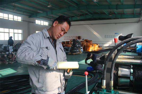 走進該公司高壓膠管車間,步入眼簾的是職工們忙碌而有序的身影,一根根原管經(jīng)過切割、剝皮、穿密封、鎖管、打壓試驗、包裝等工序,整齊地堆放在車間內(nèi)。