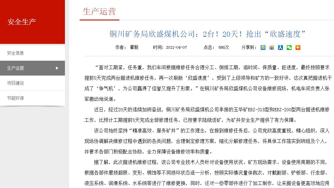 “面對工期緊,任務(wù)重,我們車間根據(jù)維修任務(wù)合理分工、倒排工期,追時間、保質(zhì)量、趕進(jìn)度,最終按照要求提前5天完成兩臺掘進(jìn)機(jī)維修任務(wù),再一次刷新‘欣盛速度’,受到了上級領(lǐng)導(dǎo)和礦方的一致好評,這次真把掘進(jìn)機(jī)干成了‘爭氣機(jī)’,為公司贏得了信譽(yù)又提升了形象。”在銅川礦務(wù)局欣盛煤機(jī)公司設(shè)備維修現(xiàn)場,機(jī)電車間負(fù)責(zé)人張軍激動地說道。