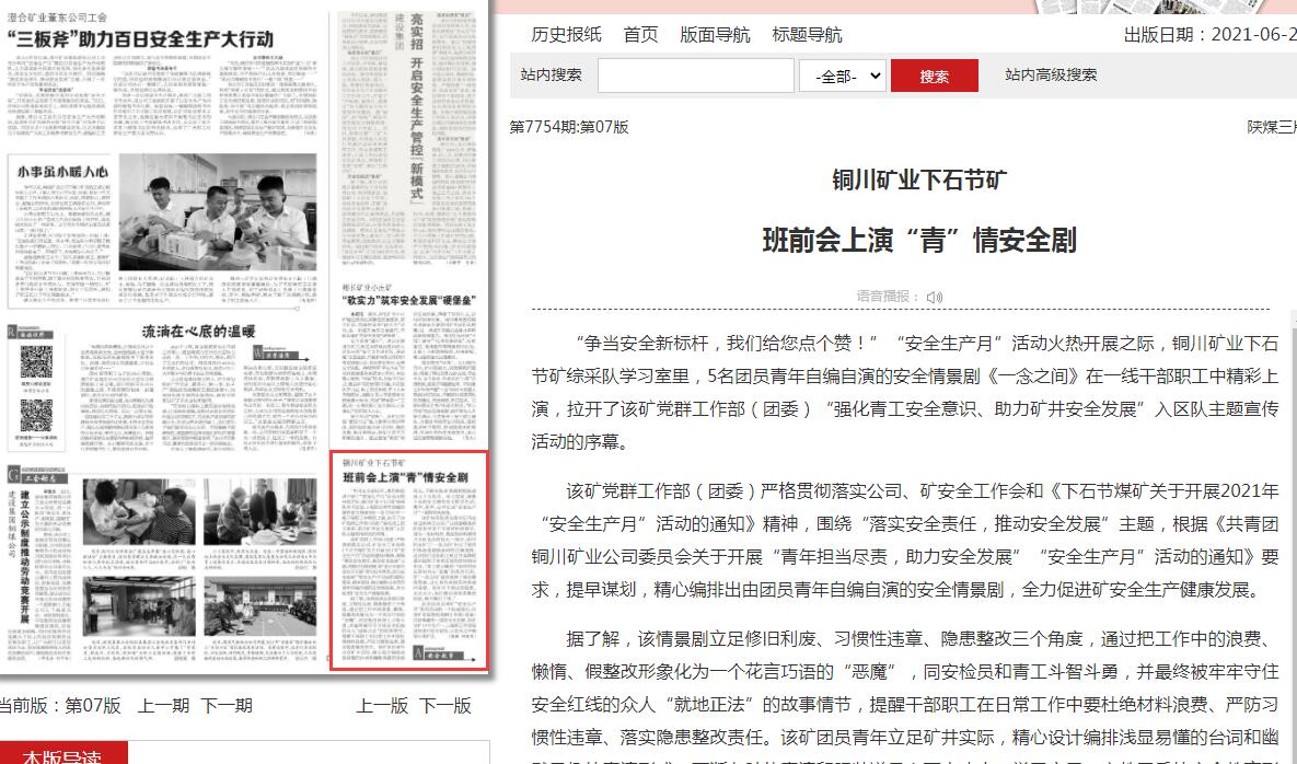 “爭當(dāng)安全新標(biāo)桿,我們給您點(diǎn)個(gè)贊!”“安全生產(chǎn)月”活動(dòng)火熱開展之際,銅川礦業(yè)下石節(jié)礦綜采隊(duì)學(xué)習(xí)室里,5名團(tuán)員青年自編自演的安全情景劇《一念之間》在一線干部職工中精彩上演,拉開了該礦黨群工作部(團(tuán)委)“強(qiáng)化青工安全意識(shí)、助力礦井安全發(fā)展”入?yún)^(qū)隊(duì)主題宣傳活動(dòng)的序幕。