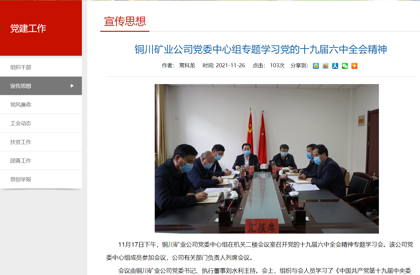11月17日下午,銅川礦業(yè)公司黨委中心組在機(jī)關(guān)二樓會(huì)議室召開(kāi)黨的十九屆六中全會(huì)精神專題學(xué)習(xí)會(huì)。該公司黨委中心組成員參加會(huì)議,公司有關(guān)部門負(fù)責(zé)人列席會(huì)議。