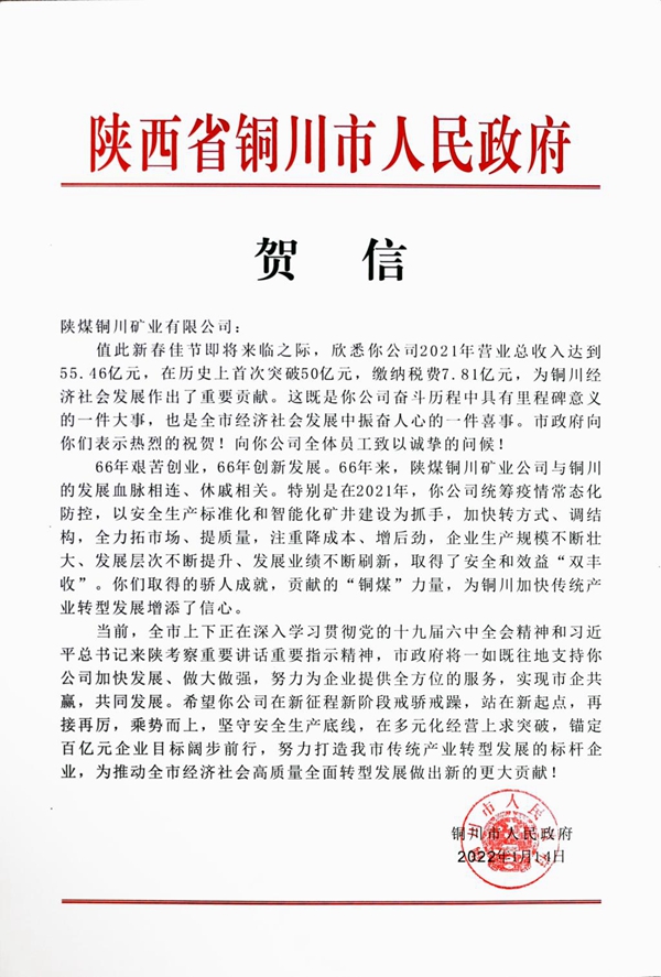 賀信希望,銅川礦業(yè)公司站在新起點(diǎn),再接再厲,乘勢而上,錨定目標(biāo)闊步前行,努力打造銅川市傳統(tǒng)產(chǎn)業(yè)轉(zhuǎn)型發(fā)展的標(biāo)桿企業(yè),為推動全市經(jīng)濟(jì)社會高質(zhì)量全面轉(zhuǎn)型發(fā)展作出新的更大貢獻(xiàn)。