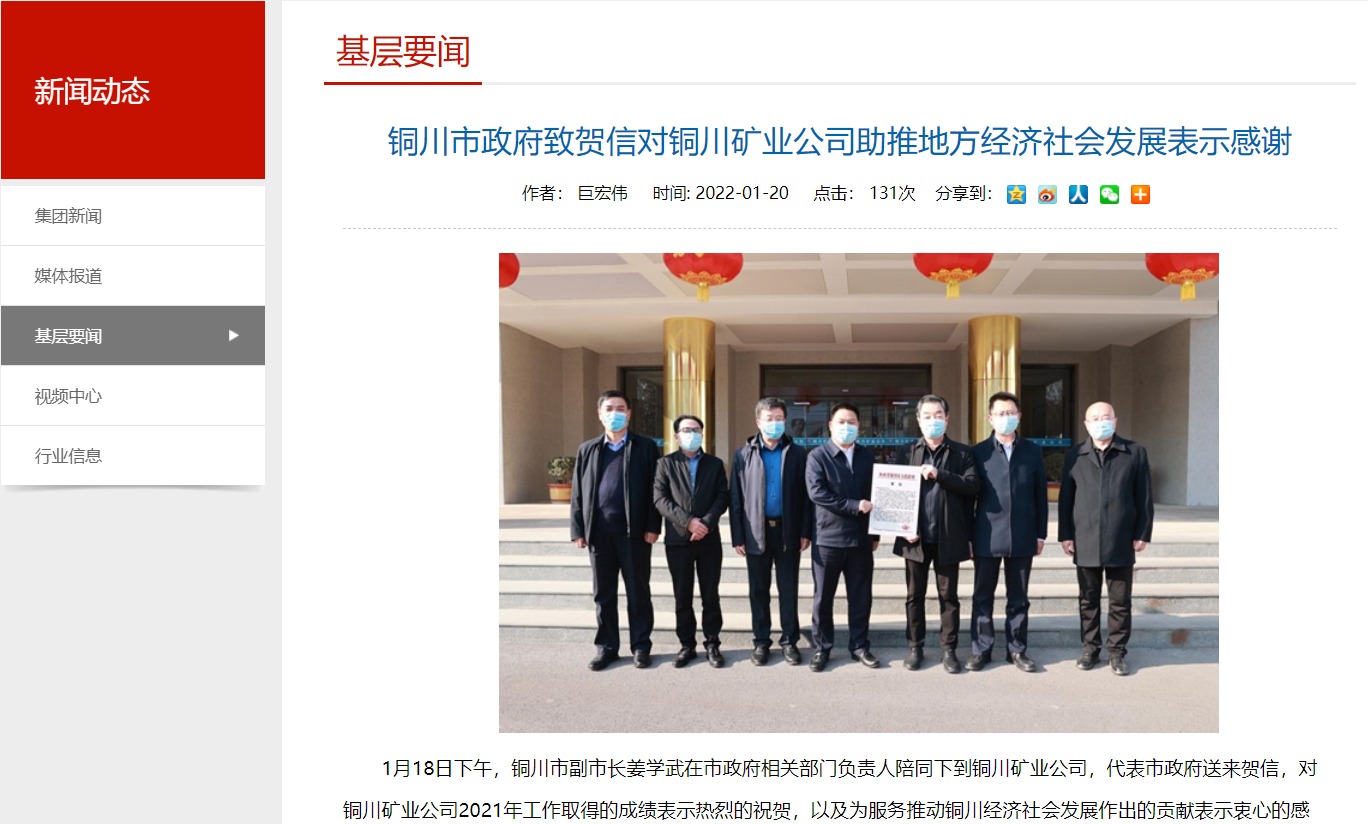 1月18日下午,銅川市副市長姜學(xué)武在市政府相關(guān)部門負(fù)責(zé)人陪同下到銅川礦業(yè)公司,代表市政府送來賀信,對銅川礦業(yè)公司2021年工作取得的成績表示熱烈的祝賀,以及為服務(wù)推動銅川經(jīng)濟(jì)社會發(fā)展作出的貢獻(xiàn)表示衷心的感謝,并祝愿銅川礦業(yè)在新起點(diǎn)新征程上取得更大的發(fā)展。