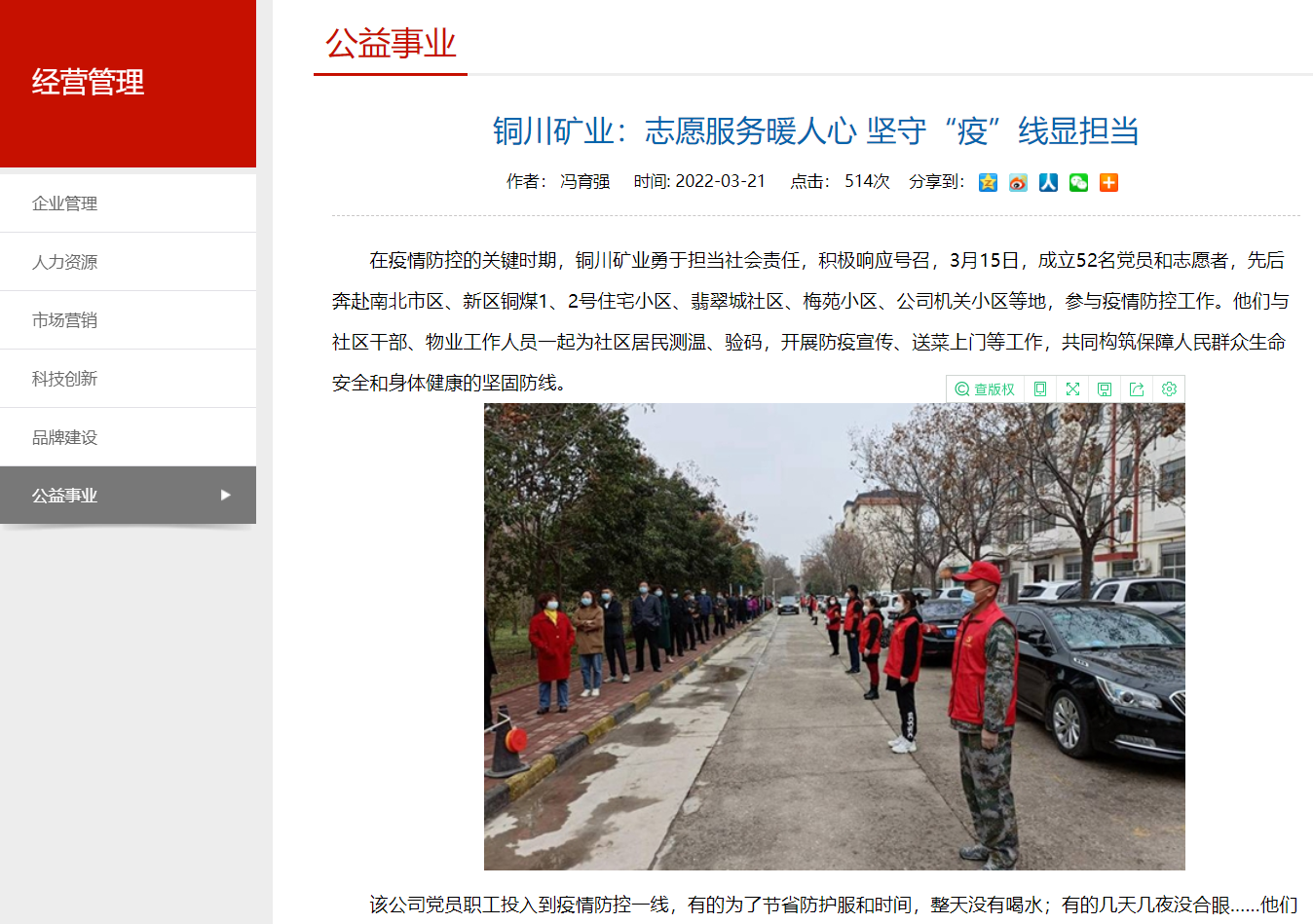 在疫情防控的關(guān)鍵時(shí)期,銅川礦業(yè)勇于擔(dān)當(dāng)社會(huì)責(zé)任,積極響應(yīng)號(hào)召,3月15日,成立52名黨員和志愿者,先后奔赴南北市區(qū)、新區(qū)銅煤1、2號(hào)住宅小區(qū)、翡翠城社區(qū)、梅苑小區(qū)、公司機(jī)關(guān)小區(qū)等地,參與疫情防控工作。他們與社區(qū)干部、物業(yè)工作人員一起為社區(qū)居民測(cè)溫、驗(yàn)碼,開展防疫宣傳、送菜上門等工作,共同構(gòu)筑保障人民群眾生命安全和身體健康的堅(jiān)固防線。