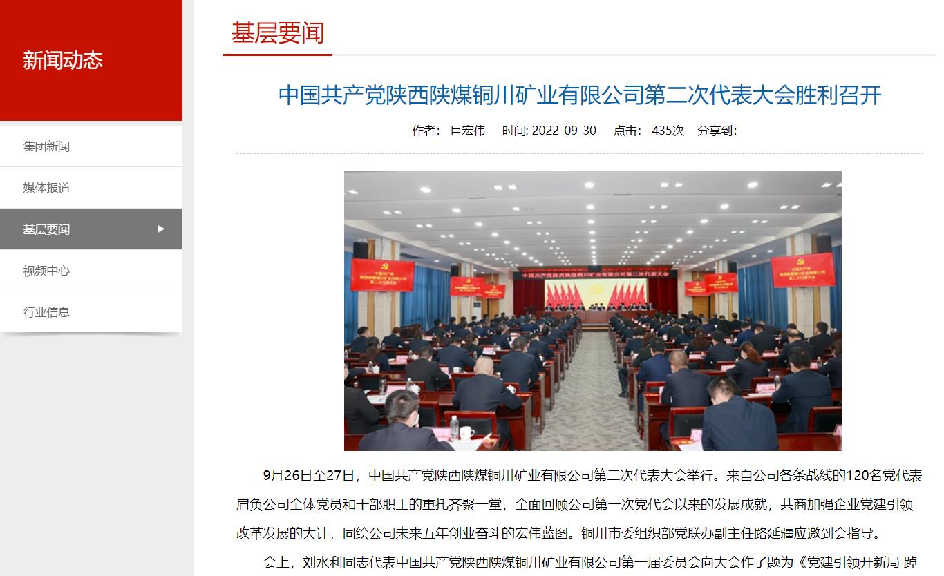 9月26日至27日,中國(guó)共產(chǎn)黨陜西陜煤銅川礦業(yè)有限公司第二次代表大會(huì)舉行。來(lái)自公司各條戰(zhàn)線的120名黨代表肩負(fù)公司全體黨員和干部職工的重托齊聚一堂,全面回顧公司第一次黨代會(huì)以來(lái)的發(fā)展成就,共商加強(qiáng)企業(yè)黨建引領(lǐng)改革發(fā)展的大計(jì),同繪公司未來(lái)五年創(chuàng)業(yè)奮斗的宏偉藍(lán)圖。銅川市委組織部黨聯(lián)辦副主任路延疆應(yīng)邀到會(huì)指導(dǎo)。