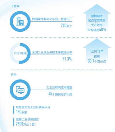 一個個競相涌現(xiàn)的新業(yè)態(tài)新模式,一次次落地顯效的新場景新嘗試,見證著黨的十八大以來,我國智能制造所取得的長足進步。這十年,產(chǎn)業(yè)數(shù)字化轉(zhuǎn)型全面推進。截至2021年底,全國工業(yè)企業(yè)關(guān)鍵工序數(shù)控化率、數(shù)字化研發(fā)設(shè)計工具普及率分別達到51.3%、74.7%,比2012年分別提高30.7、25.9個百分點。這十年,智能制造發(fā)展水平穩(wěn)步提升。我國已建成700多個數(shù)字化車間、智能工廠,智能制造試點示范項目生產(chǎn)效率平均提高48%,產(chǎn)品研制周期平均縮短38%,產(chǎn)品不良品率平均降低35%,煉化、印染、家電等領(lǐng)域智能制造水平處于世界領(lǐng)先地位。這十年,智能制造的底座更為堅實。工業(yè)互聯(lián)網(wǎng)應(yīng)用已覆蓋45個國民經(jīng)濟大類,培育較大型工業(yè)互聯(lián)網(wǎng)平臺150余家,連接工業(yè)設(shè)備超過7800萬臺(套)。