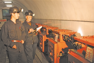 過去,井下設(shè)備巡檢只能靠人工。圖為陜煤集團兩名工人在巡檢。