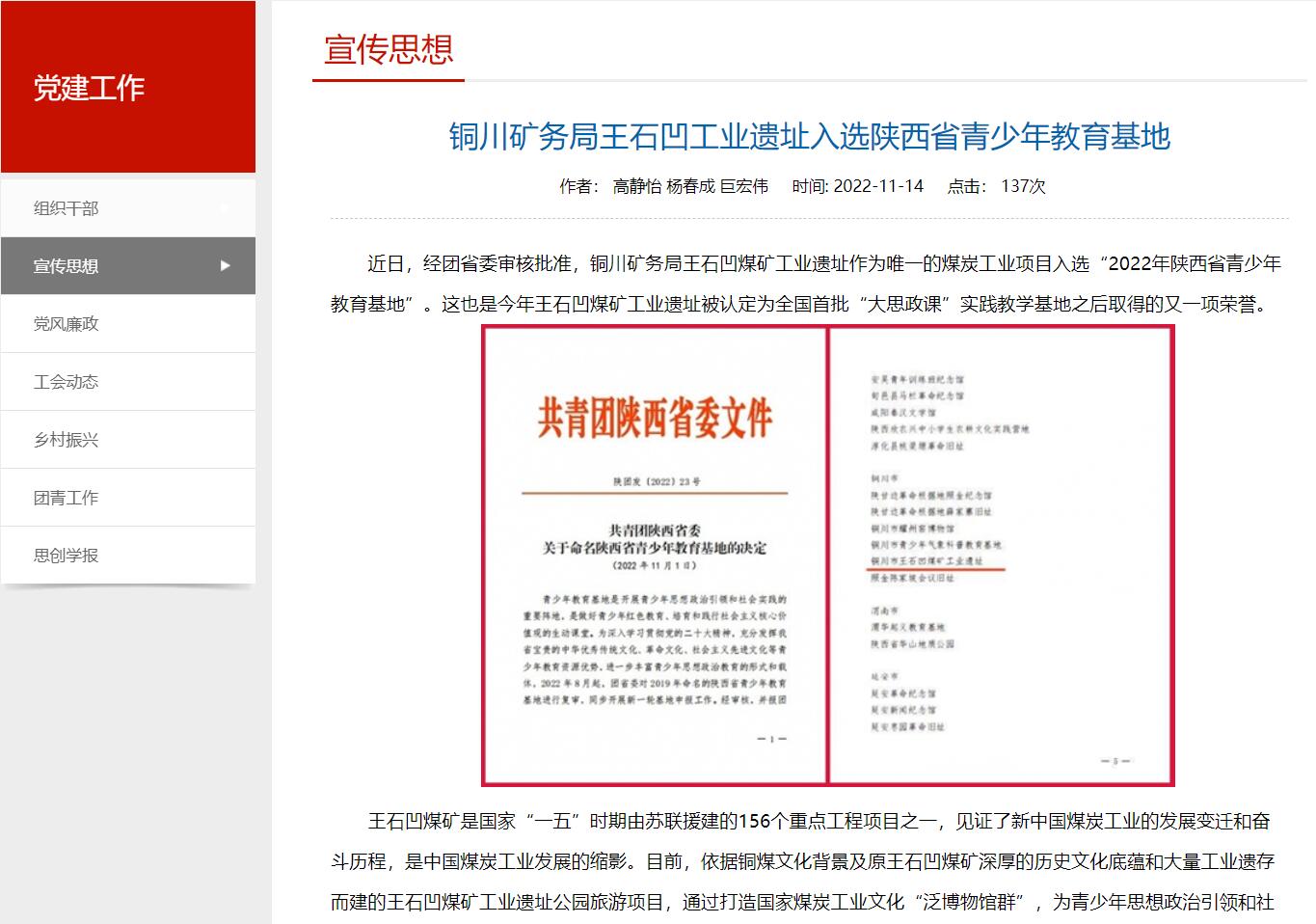 近日,經(jīng)團省委審核批準(zhǔn),銅川礦務(wù)局王石凹煤礦工業(yè)遺址作為唯一的煤炭工業(yè)項目入選“2022年陜西省青少年教育基地”。這也是今年王石凹煤礦工業(yè)遺址被認定為全國首批“大思政課”實踐教學(xué)基地之后取得的又一項榮譽。