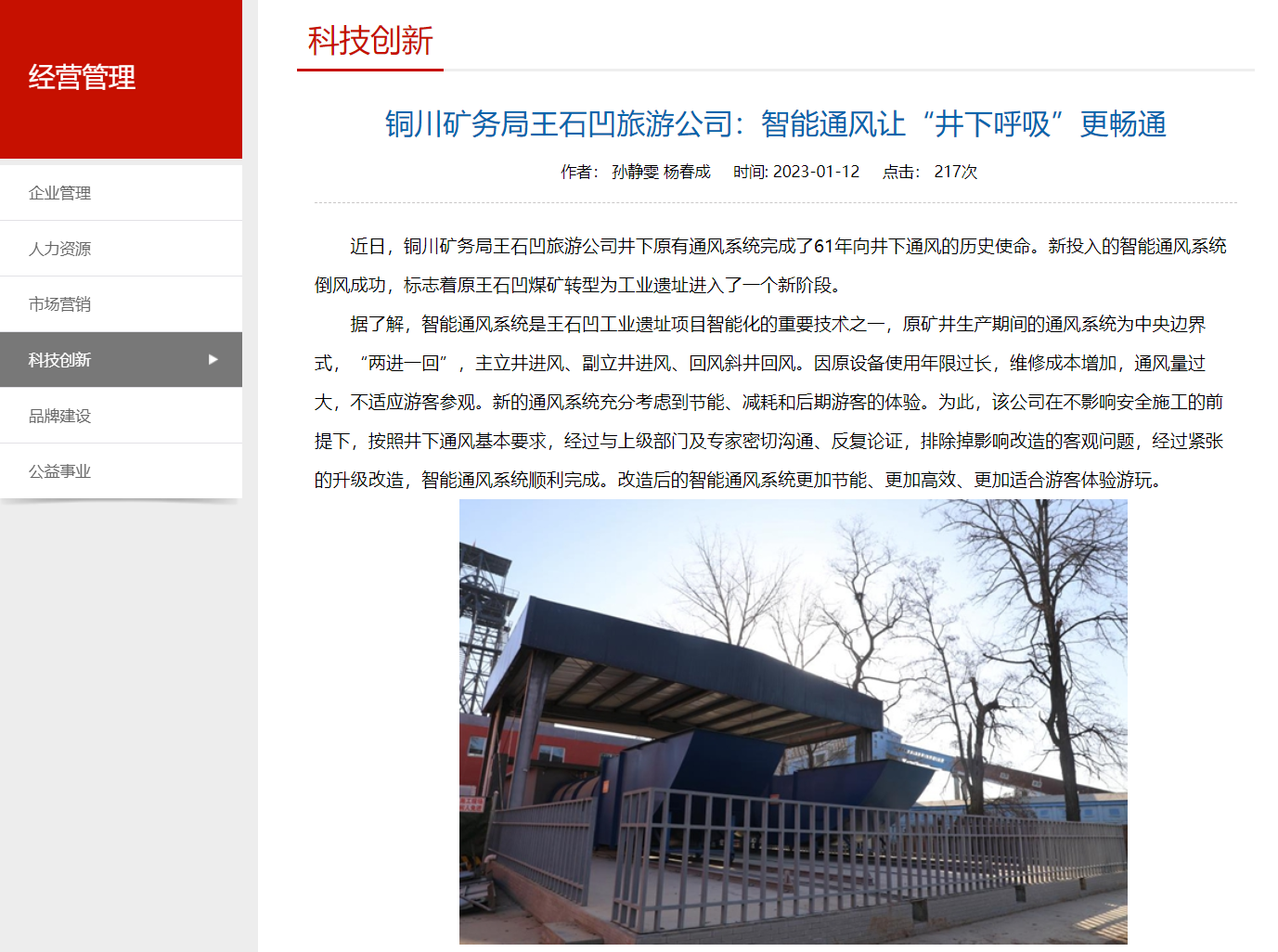 近日,銅川礦務(wù)局王石凹旅游公司井下原有通風系統(tǒng)完成了61年向井下通風的歷史使命。新投入的智能通風系統(tǒng)倒風成功,標志著原王石凹煤礦轉(zhuǎn)型為工業(yè)遺址進入了一個新階段。