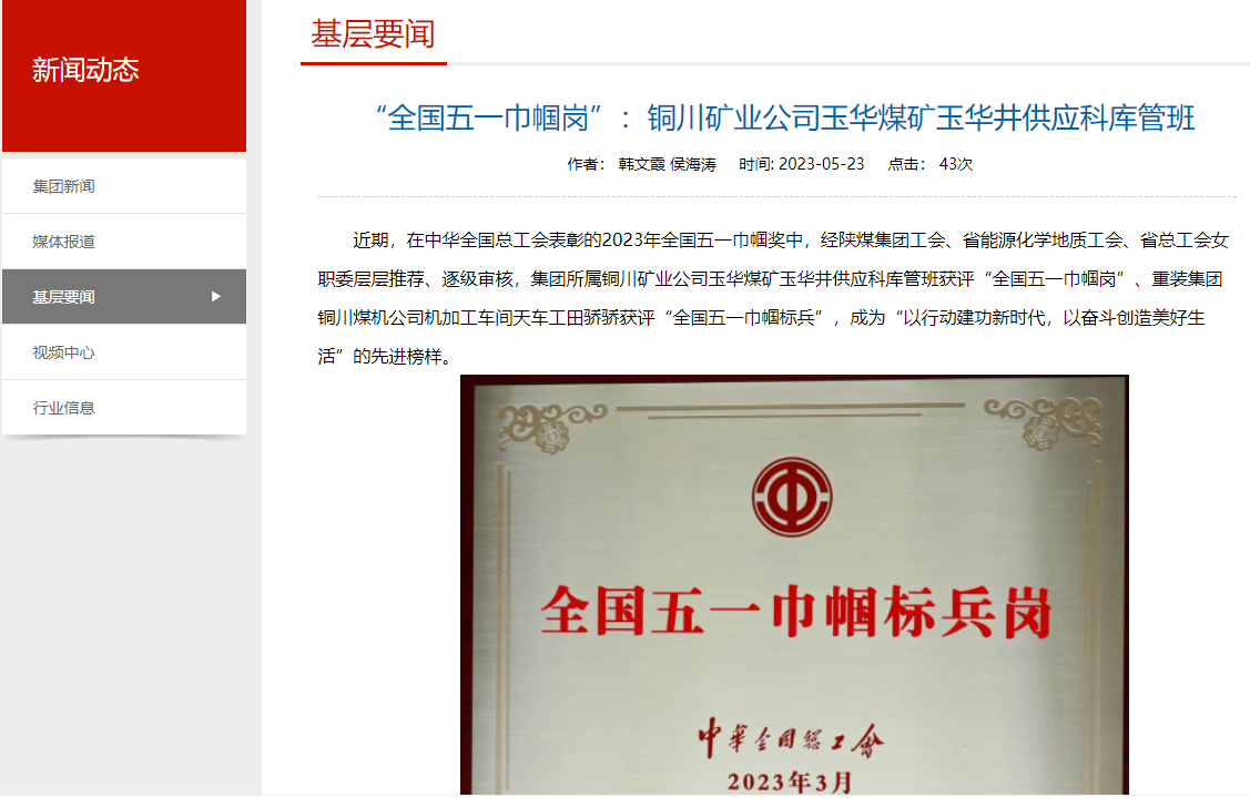 “同心山成玉,協(xié)力土變金”,通過團(tuán)結(jié)協(xié)作,庫管班多次被礦評為明星班組、安全先進(jìn)班組、巾幗示范崗;先后被礦區(qū)工會、集團(tuán)工會授予“巾幗建功示范崗”;被銅川市婦聯(lián)授予“銅川市巾幗文明崗”;被省總工會授予“五一巾幗標(biāo)兵崗”。2023年3月又被全國總工會授予“全國五一巾幗標(biāo)兵崗”榮譽稱號。 (韓文霞 侯海濤)