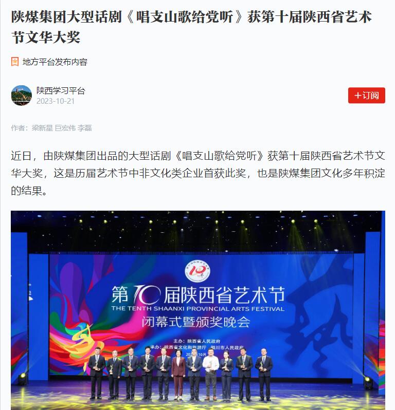 近日,由陜煤集團出品的大型話劇《唱支山歌給黨聽》獲第十屆陜西省藝術(shù)節(jié)文華大獎,這是歷屆藝術(shù)節(jié)中非文化類企業(yè)首獲此獎,也是陜煤集團文化多年積淀的結(jié)果。