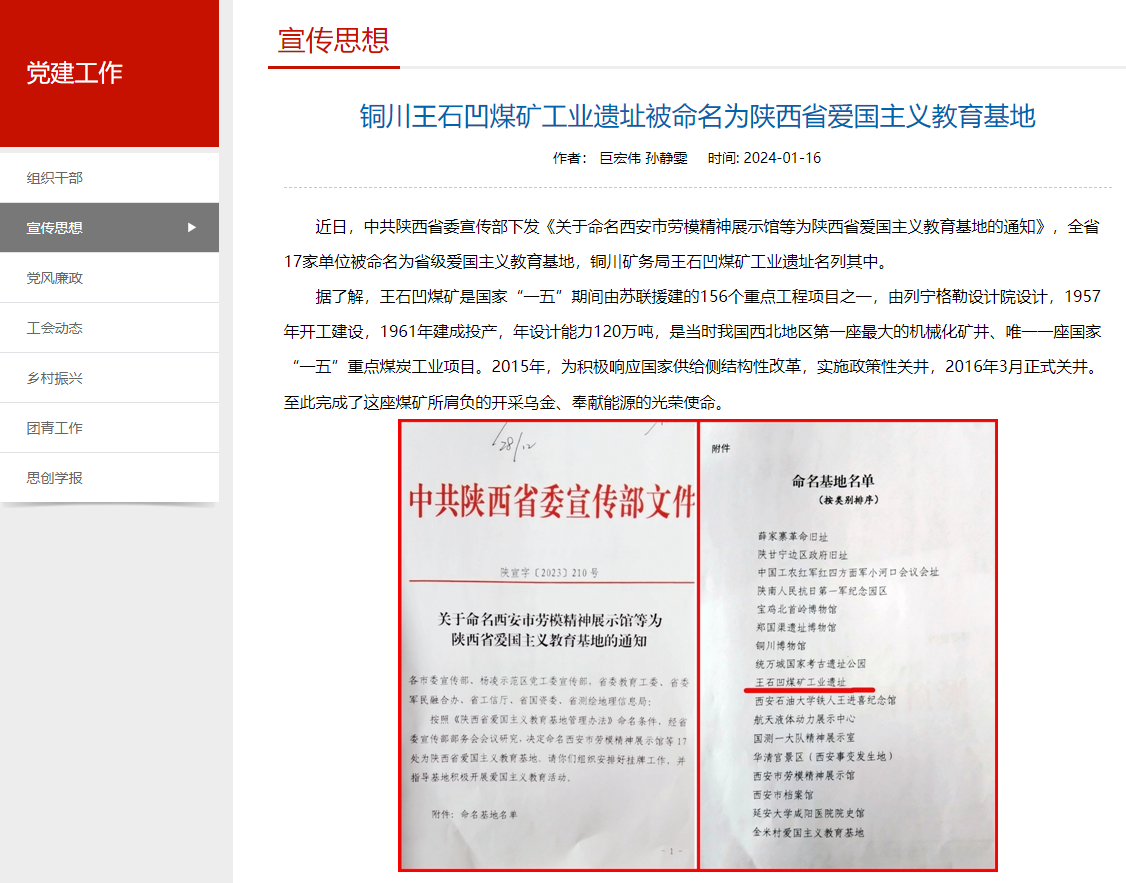 銅川王石凹煤礦工業(yè)遺址被命名為陜西省愛國主義教育基地