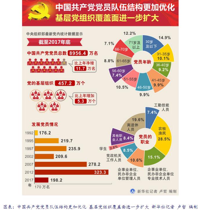 截至2017年12月31日,中國共產(chǎn)黨黨員總數(shù)為8956.4萬名,比上年凈增11.7萬名,增幅為0.1%。