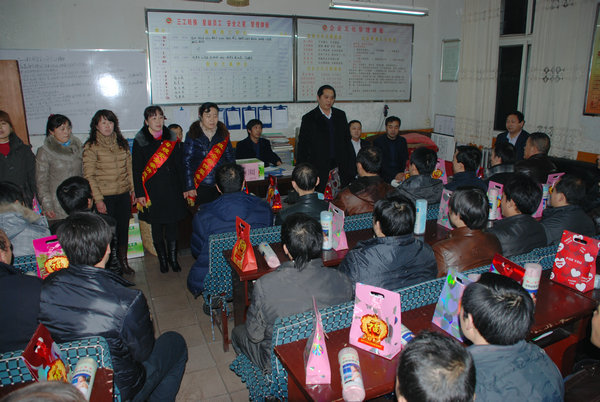 在綜采隊(duì)學(xué)習(xí)室,面對(duì)礦嫂們真誠(chéng)的拜年祝福,30多名職工集體站起身答謝:礦嫂們辛苦了,我們向你們祝福感謝!綜采隊(duì)隊(duì)長(zhǎng)滕建德說(shuō):這場(chǎng)面真熱烈、真感人、真鼓舞人心、真令人高興,礦嫂服務(wù)隊(duì)的安全活動(dòng)越來(lái)越新穎了。拜完年后,礦嫂們?yōu)槊课宦毠に蜕狭司碌亩Y品盒,禮品是礦嫂們自己精心制作的四樣小食品。礦嫂服務(wù)隊(duì)在拜年祝辭中說(shuō):壽桃面點(diǎn)代表礦工兄弟家庭和睦、老人安康長(zhǎng)壽;軟酥甜餅象征著礦工兄弟生活甜蜜,一年比一年好;小紅果祝愿礦工兄弟日子紅紅火火,工作創(chuàng)新進(jìn)步;芝麻團(tuán)寓涵礦工兄弟們闔家團(tuán)圓,幸福美滿。拜年辭還說(shuō):礦工兄弟以礦為家,堅(jiān)守崗位,精神難能可貴,品德令人稱贊,你們是企業(yè)的功臣!拜年祝辭飽含著真誠(chéng)愛(ài)心,充滿著熱情關(guān)切,激蕩著礦工們沸騰的心潮。大家異口同聲回答:感謝礦嫂關(guān)愛(ài),保證安全生產(chǎn)!給堅(jiān)守崗位的職工拜年,這只是礦嫂服務(wù)隊(duì)春節(jié)安全活動(dòng)的一部分,其目的就是春節(jié)給職工送祝福、送溫暖、送愛(ài)心、送安全囑咐,讓職工體驗(yàn)到礦山如家的感受。大年初一的礦嫂服務(wù)隊(duì)大拜年,在各生產(chǎn)區(qū)隊(duì)都出現(xiàn)了感人、動(dòng)人的場(chǎng)面,大家稱贊礦嫂服務(wù)隊(duì)為職工送來(lái)了精神力量。