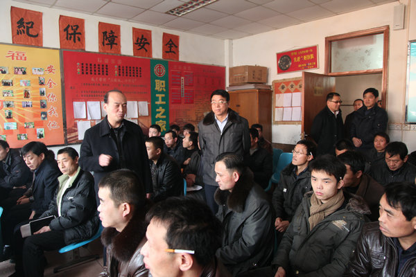 礦長解耀明、副礦長郭龍煥深入采掘一線班前會慰問節(jié)日期間堅守崗位礦工