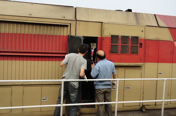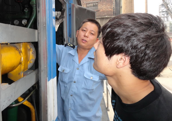 組圖為機(jī)車司機(jī)向新學(xué)員介紹機(jī)車結(jié)構(gòu)及相關(guān)設(shè)施