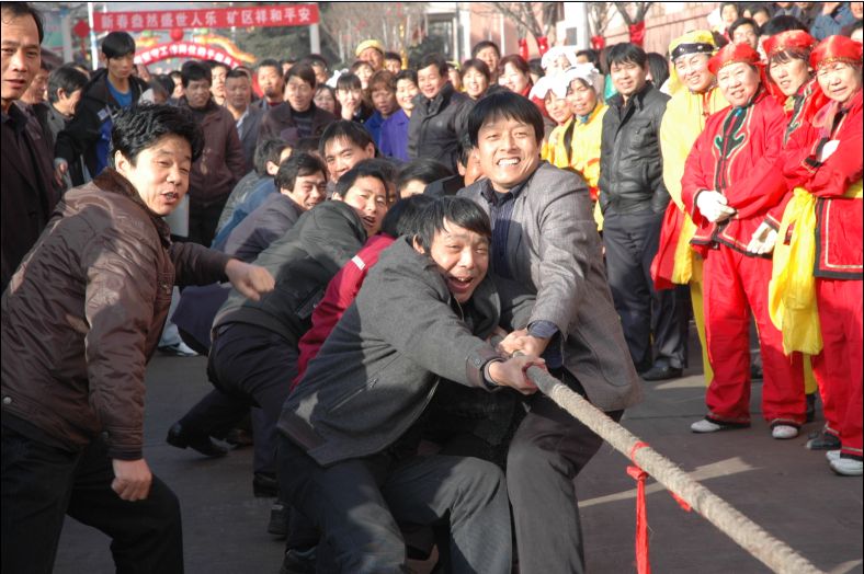 為活躍節(jié)日氣氛,讓員工過(guò)上一個(gè)歡快祥和的元宵佳節(jié),公司工會(huì)組織各生產(chǎn)單位舉行了大型的拔河比賽。上午9點(diǎn),礦部?jī)?nèi)爆竹聲聲,鑼鼓喧天,彩旗招展,鑼鼓隊(duì)、舞龍隊(duì)、秧歌隊(duì)沿礦區(qū)一邊行進(jìn)一邊表演,吸引了路人的目光。單身樓前聚集了參加比賽的員工和前來(lái)加油助威的家屬,把整個(gè)單身樓前圍得是水泄不通,熱鬧非凡。比賽采用三局兩勝制,共12支參賽隊(duì)伍,8支男隊(duì),4支女隊(duì),男隊(duì)經(jīng)半決賽淘汰,由決賽遴選出冠軍,而女隊(duì)采用單循環(huán)。首先出場(chǎng)的是基建隊(duì)和掘一隊(duì),剛一出場(chǎng)就給大家?guī)?lái)不小的驚訝,因?yàn)榛?duì)是男女混搭的。在裁判員一聲哨音下,兩支隊(duì)伍喊著號(hào)子,開(kāi)始了激烈的比賽,也許真是應(yīng)了“男女搭配干活不累”,第一局基建隊(duì)竟然贏了。但接下來(lái),掘一隊(duì)不甘失敗,連扳兩局,最終以2:1贏得比賽。在比賽過(guò)程中,氣氛最熱烈的還屬醫(yī)院和物管科,兩方女將勢(shì)均力敵,不斷僵持,從場(chǎng)地中央拉到場(chǎng)地邊緣,仍不分上下,員工家屬在旁不斷呼喊,在物管科的女將不懈堅(jiān)持下,最終以2:0戰(zhàn)勝醫(yī)院。而在采一和采三比賽中,更讓人感動(dòng)的是,在拔河比賽進(jìn)行中,一名員工的鞋子被踩掉,但他光著腳仍完成了整個(gè)比賽。經(jīng)過(guò)半決賽,角逐出機(jī)關(guān)、運(yùn)輸區(qū)、采一3支隊(duì)伍進(jìn)入決賽;在決賽中,由于機(jī)關(guān)不敵運(yùn)輸區(qū)而位居第三,運(yùn)輸區(qū)乘勝追擊拿下采一,贏得冠軍,而采一屈居第二。遠(yuǎn)處鑼鼓隊(duì)、舞龍隊(duì)、秧歌隊(duì)緩緩走來(lái),讓比賽在一片歡歌笑語(yǔ)、鑼鼓喧天的氣氛中拉下帷幕。