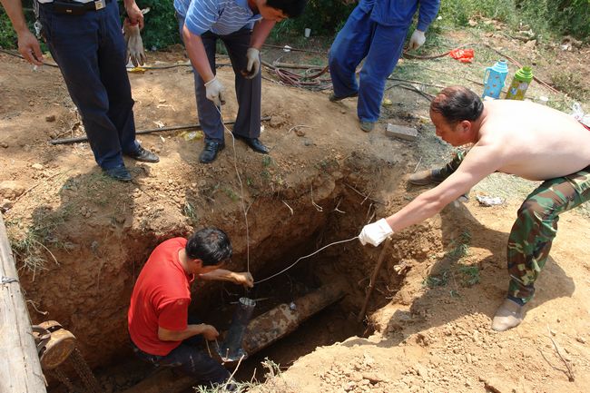 6月19日上午,負(fù)責(zé)向礦區(qū)轉(zhuǎn)供水的四泵站管路突然出現(xiàn)故障。工作人員仔細(xì)檢查,原來(lái)是八寸供水管路出現(xiàn)斷裂,向外滲水,影響正常供水。副礦長(zhǎng)屈國(guó)慶、物業(yè)管理公司經(jīng)理薛振軍、黨支部書(shū)記雷建國(guó)等領(lǐng)導(dǎo)得知后,立即組織人員趕往事發(fā)現(xiàn)場(chǎng)??吹綆资组L(zhǎng)的山體裂隙處向外冒水,惠建平、曹耀文、劉曹、黎俊平等同志立即拿起鐵锨、鎬鏟等工具順著山體裂隙查找尋找原因。四泵站位于金紅公路的山梁上,兩邊是大坡,坡上長(zhǎng)滿荊棘和棗刺,行走不便,大家衣著單薄,顧不上滑破臉和手臂。副經(jīng)理高廣林、胡留發(fā)拿著工具和大家一起順著山體查找水管斷裂處。副礦長(zhǎng)屈國(guó)慶時(shí)刻叮囑大家注意安全。天越來(lái)越熱,大家顧不上擦汗,揮鏟舞鎬清理淤泥。一處又一處的裂隙淤泥被清理出來(lái)了,還是沒(méi)有找到故障處。填平山體裂隙,揮舞鐵锨大干。烈日當(dāng)頭照,汗水濕透了衣裳、有的同志干脆光著膀子,在棗刺叢生的灌木堆里尋找、挖漕。有的同志臉上,手臂,肩膀上被棗刺劃破了,汗水流過(guò),向被馬蜂蟄了一樣疼。但是大家顧不了這么多了,一掀一鏟的污泥被清理出了山體裂隙。指揮員們一邊查看進(jìn)程,一邊叮囑大家多喝水,防止中暑。物業(yè)管理公司經(jīng)理薛振軍的愛(ài)人熬了綠豆湯、買來(lái)了西瓜,送到了工地上,大家一片歡呼。在一片感謝聲中,尋找水管斷裂處的工作在烈日的暴曬下繼續(xù)進(jìn)行。同志們汗流浹背,輪番上前,終于在20日上午找到了供水管路的兩處“傷痕”。機(jī)電車間的技術(shù)人員趕到現(xiàn)場(chǎng),將兩處裂隙處需要的“套袖”進(jìn)行了統(tǒng)計(jì)。趁此機(jī)會(huì),大家將水管裂隙處周圍的淤泥、雜物清理干凈,將錯(cuò)位的水管對(duì)齊,用吊鏈將水管平調(diào),保持最佳工作狀態(tài)。很快,所需配件被加工出來(lái)。大家顧不上兩天來(lái)的疲勞,立即將“套袖”緊固在水管裂隙處,接著,焊縫、灌鉛,封口,各項(xiàng)工作程序有條不紊進(jìn)行。20日中午12點(diǎn),四泵站的供水主管路在大家的共同努力下,終于康復(fù)起來(lái)了。水泵旋轉(zhuǎn)起來(lái)了,轟鳴的水泵聲和著嘩嘩水聲流向礦區(qū),流向職工家屬的心中……
