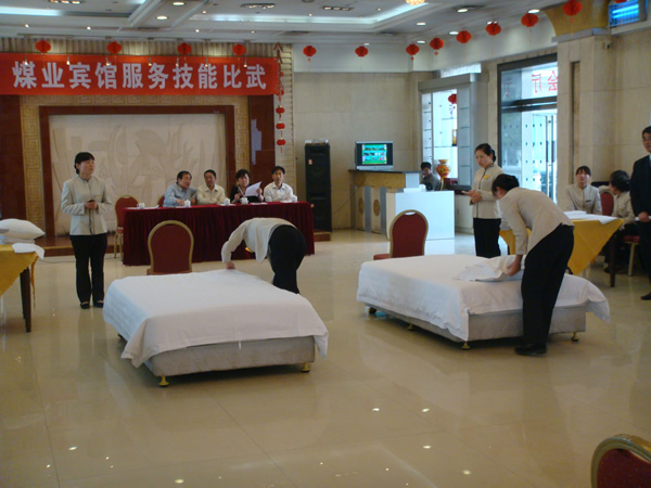 這次員工服務(wù)崗位技能比武活動(dòng),是煤業(yè)賓館成立以來(lái)第四次技能比武和練兵活動(dòng),旨在提高員工規(guī)范化服務(wù)是平,培養(yǎng)技能型人才,提升賓館核心競(jìng)爭(zhēng)力。經(jīng)過(guò)層層選拔,14名員工現(xiàn)場(chǎng)進(jìn)行了客房中式鋪床,客房前臺(tái)接待、問(wèn)詢(xún),中餐宴會(huì)擺臺(tái)、斟酒三個(gè)項(xiàng)目的決賽。員工們用靈巧的雙手、熟練的技能、流利的回答問(wèn)題和應(yīng)對(duì)模擬顧客異常事件機(jī)智文明的用語(yǔ)博得了大家的陣陣掌聲。該賓館評(píng)委們嚴(yán)格按照酒店管理行業(yè)標(biāo)準(zhǔn),對(duì)每個(gè)細(xì)節(jié)進(jìn)行考評(píng)打分。通過(guò)現(xiàn)場(chǎng)緊張激烈的比賽,酒店員工王亞丹、曹春蕾分獲客房中式鋪床和中餐宴會(huì)擺臺(tái)第一名,喬美麗、李婷等分獲第二、第三名。賓館和工委領(lǐng)導(dǎo)對(duì)獲獎(jiǎng)員工頒發(fā)了獎(jiǎng)品和榮譽(yù)證書(shū),并合影留念。
