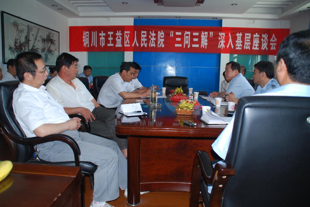 5月30日銅川市王益區(qū)人民法院院長(zhǎng)吳玉亭一行10余人,深入多經(jīng)公司,就“三解三問”活動(dòng)交流座談,多經(jīng)公司黨政領(lǐng)導(dǎo)、全體管理干部參加了座談。