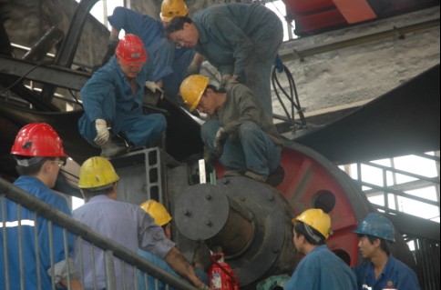 5月1日一大早,該礦黨政主要領(lǐng)導(dǎo)已經(jīng)坐在調(diào)度指揮中心,不停地通過監(jiān)控屏幕觀看各個(gè)檢修點(diǎn)的工作進(jìn)展情況,指揮協(xié)調(diào)各檢修點(diǎn)檢修工作。冒著綿綿細(xì)雨和陣陣涼風(fēng),分管機(jī)電動(dòng)力的副礦長馬銅生、副礦長馬現(xiàn)衛(wèi)、副總黃孝民等領(lǐng)導(dǎo),趕赴距礦數(shù)公里以外的主斜井膠帶機(jī)房,現(xiàn)場指揮在這里進(jìn)行更換主斜井膠帶3號、4號驅(qū)動(dòng)滾筒以及對主斜井皮帶4好接頭進(jìn)行硫化的重點(diǎn)檢修工作。為保證驅(qū)動(dòng)滾筒的順利更換,運(yùn)轉(zhuǎn)隊(duì)隊(duì)長高同生、書記孟凡輝等隊(duì)領(lǐng)導(dǎo),身穿工作衣、腰扎皮帶、頭戴礦燈、安全帽,一身煤灰、滿手油污,組織維修班、運(yùn)轉(zhuǎn)班以及從綜掘一隊(duì)調(diào)來協(xié)助工作的30多名技術(shù)工人,從凌晨開始,提前將更換的托帶滾筒吊裝到位,頂著綿綿細(xì)雨和陣陣涼風(fēng),緊張而忙碌地拆卸損壞的驅(qū)動(dòng)滾筒,有條不紊換裝新滾筒。副礦長馬銅生、馬現(xiàn)衛(wèi)以及礦動(dòng)力科技術(shù)人員,現(xiàn)場同維修人員一道,研究施工方案,指揮安裝和維修。參與更換滾筒的職工,同從指揮、奮力大干,按照安全施工方案和技術(shù)措施,認(rèn)真開展了各項(xiàng)拆卸和更換工作,于5月2日早6點(diǎn)40分,使主斜井膠帶輸送機(jī)驅(qū)動(dòng)滾筒提前安裝到位。