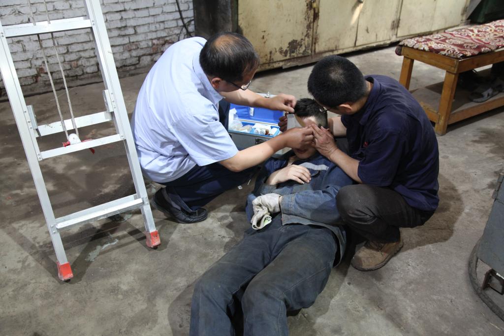 高空作業(yè)事故演練,模擬一名職工在高空作業(yè)時(shí),不慎跌落,在旁邊工作的同事看到后緊急施救的場(chǎng)景。參與救助的職工迅速撥打120急救電話(huà),詳細(xì)報(bào)告事故種類(lèi)、地點(diǎn)和目前患者情況,請(qǐng)求立即派救護(hù)車(chē),并當(dāng)即向分管領(lǐng)導(dǎo)報(bào)告事故狀況并請(qǐng)求派人幫助。其他參與救援的職工迅速劃定警戒線(xiàn),對(duì)受傷者大聲的呼叫,判斷其意識(shí)情況,在檢查心跳、呼吸、瞳孔情況后,擺正受傷者姿勢(shì),并做好頸椎和腰椎的固定保護(hù)。解開(kāi)患者的上衣,進(jìn)行體外心臟除顫,查看無(wú)呼吸與心跳后,清除口腔內(nèi)的異物,進(jìn)行心肺復(fù)蘇,經(jīng)過(guò)反復(fù)施救,直至患者恢復(fù)呼吸和心跳,等待120急救車(chē)的到來(lái)......