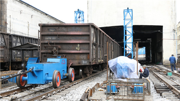 10月2日,氣溫13度。鐵路裝車系統(tǒng)升級改造施工現(xiàn)場,電焊火花四濺。新“鐵?!北寂茉谲壍谰€上,牽引調(diào)度絞車已投入使用。