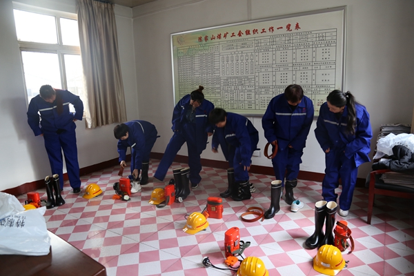 主持人一句“開(kāi)始你們的表演!”,礦嫂們迅速地拿起工裝,先穿褲子、膠靴、再穿上衣、系好扣子、帽帶,檢查好頭燈,正確佩戴自救器……看著妻子們不服輸?shù)谋绕磩牛V工們個(gè)個(gè)臉上洋溢幸福的笑容,大聲吶喊:“加油,老婆,小心摔倒!”