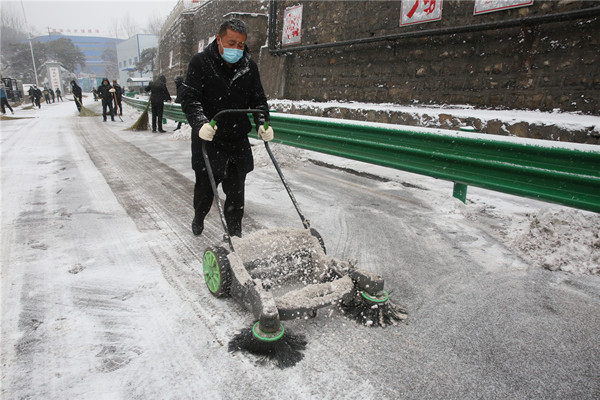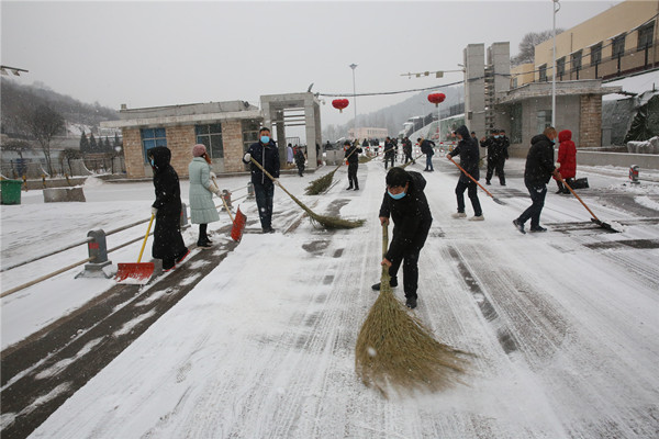 掃雪中,該礦機關各部室所有成員在礦黨政的統(tǒng)一安排部署下,分管領導的帶領下,采取分組包段制,他們有的手持掃把、有的手持鐵鍬、有的手推鏟車等掃雪工具,從馬坊村進礦聚財橋處到礦內運煤專線及辦公樓前環(huán)形路段、工業(yè)廣場和家屬區(qū)等所有道路上的積雪進行全面清掃,雖然天空還在飄著雪花,寒風刺骨凜冽,但他們個個干勁十足,忙碌的身影構成了一道靚麗的風景線,在近4個多小時的清掃,礦內道路上的積雪被清理了出來,方便了上下班職工和車輛安全出行。