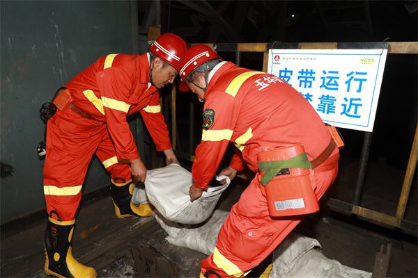 演練開始。礦防汛指揮部“叫應(yīng)”各區(qū)域、各單位的應(yīng)急搶險、值守人員在調(diào)度中心緊急集合。按照規(guī)定時間,2個戰(zhàn)備值班救護小隊和25名搶險救災(zāi)人員及工程、救護車輛,裝載著鐵鍬、編織袋、管路等物資集結(jié)待命??傊笓]通報汛情,隨機選取主斜井井口作為演練地點,模擬強降雨造成地面積水,且水位迅速上漲,存在雨水倒灌井口風險。運轉(zhuǎn)隊組織主斜井區(qū)域全部人員迅速撤離,搶險救災(zāi)隊伍聞警出動到達現(xiàn)場,專人排查清點撤離職工,并就近打開防汛物資庫,使用已充填沙袋在井口快速構(gòu)筑臨時擋水墻。