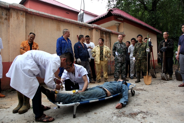 此次演練內(nèi)容預(yù)設(shè)該礦運銷區(qū)辦公樓后山體因連日暴雨小面積滑坡,造成民房側(cè)墻垮塌,門前被淤泥封堵,房內(nèi)一人被困,等待救援。接到事故救援匯報后,該礦立即啟動應(yīng)急救援預(yù)案,現(xiàn)場救援組迅速趕往救援地點,在應(yīng)急救災(zāi)總指揮部的指揮下,后勤保障組、醫(yī)療救護(hù)組、物資供應(yīng)組、治安穩(wěn)定組按預(yù)案責(zé)任分工有條不紊地開展救援工作,演練過程緊張有序、配合默契,圓滿完成了應(yīng)急救援演練任務(wù)。