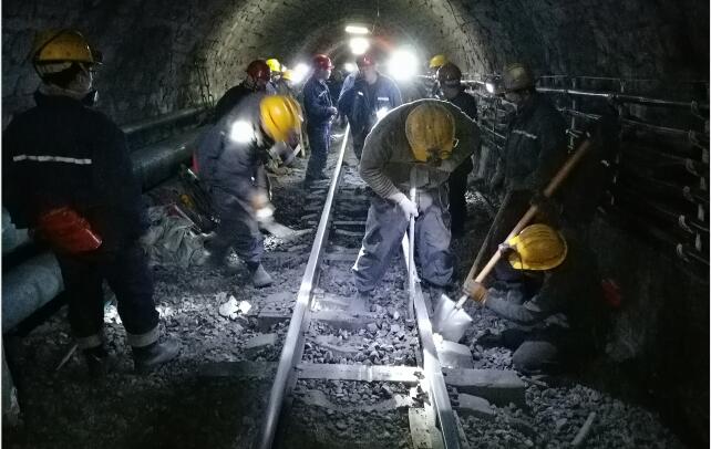 更換副絞鋼絲繩和副斜井軌道由機(jī)電隊(duì)組織施工,綜掘三隊(duì)配合共同完成,更換鋼絲繩期間,施工單位通過人力將舊鋼絲繩從副絞天輪上拆卸下來,再將新鋼絲繩一頭竄入滾筒固定,另一頭與鉤頭合金巴士澆筑,完成鋼絲繩更換工作。更換副斜井軌道期間,施工單位嚴(yán)格按照行車不檢修的原則,將需要更換的軌道、軌枕、建筑材料提前放入施工地點(diǎn),待車輛發(fā)完后,組織檢修人員逐次副斜井井口變坡點(diǎn)、井口向下200米處、550米處施工段進(jìn)行施工,組織人力使用洋鎬、鐵鍬等工具調(diào)整道基、軌枕和軌道,并對其進(jìn)行固定,完成軌道更換工作。