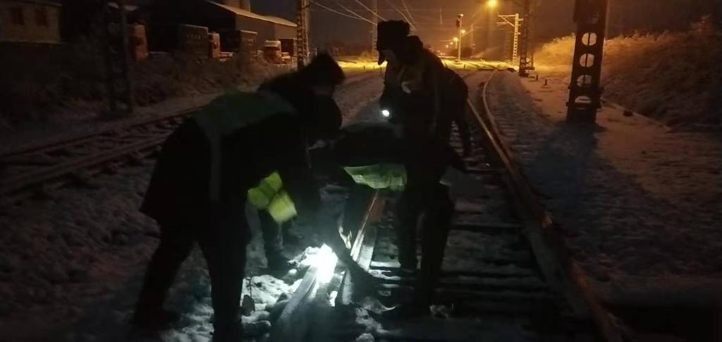 21日凌晨2:00,工電車間主任下達(dá)指令,各工區(qū)迅速組織工電人員拿著鐵锨、防凍液、吹雪機(jī)等除雪工具,對(duì)孟家壕車站、化工南車站、液化廠車站、轉(zhuǎn)水廟車站道岔進(jìn)行掃雪作業(yè)。分別于2點(diǎn)和7點(diǎn)進(jìn)行掃雪?!把┚褪敲?,無論是白天還是黑夜,雪不停、掃不止?!苯?jīng)過作業(yè)人員的奮戰(zhàn),榆橫項(xiàng)目部管內(nèi)共出
