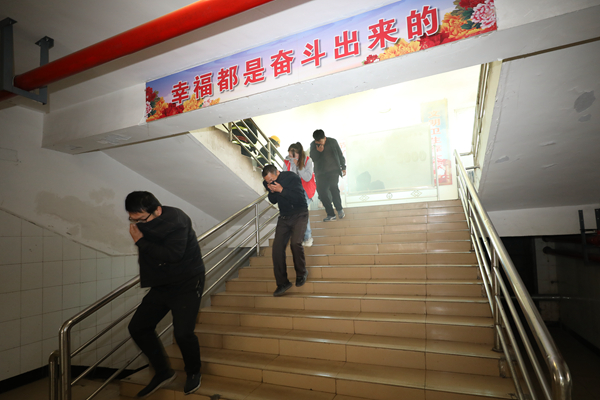 上午9點30分,該礦一號單身樓內(nèi)突然濃煙四起,火災(zāi)警報迅速拉響,呼喊撤離的聲音此起彼伏。公司礦山救護大隊四中隊的救護隊員沖鋒在前,引導樓內(nèi)職工快速有序逃生,大家一手捂著口鼻、快速彎腰小跑,有序撤離“火災(zāi)現(xiàn)場”。救護隊員迅速對樓內(nèi)火災(zāi)進行撲滅,檢查樓內(nèi)人員疏散情況,向總指揮報告。在演練過程中,火災(zāi)應(yīng)急預(yù)案啟動,現(xiàn)場指揮組、通訊聯(lián)絡(luò)組、滅火行動組、疏散救護組各司其責,迅速行動。