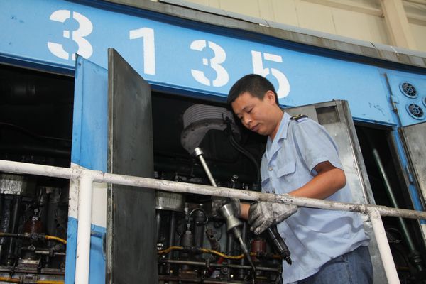 只見副司機王陽陽手持工具、手燈、筆、紙,開始對內(nèi)燃機車進行檢查。監(jiān)考官郭振對筆者說“這個檢查面非常廣、點也非常多,主要對內(nèi)燃機車下面行走部的車鉤、閘缸閥、車輪、沙箱、減壓器、緩沖部和內(nèi)燃機車上面的風(fēng)泵間、采油機間、電機間、電器間、司機室進行檢查?!?/p>