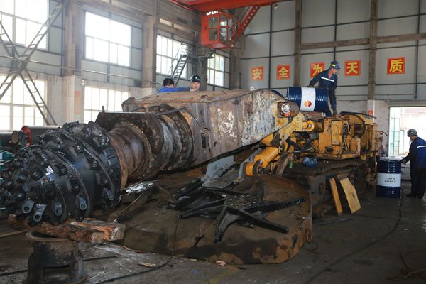 該礦200型綜掘機在投入井下巷道掘進施工以來,由于設備長期使用,各個部件和液壓傳動系統都出現了不同程度的磨損。為了不影響后續(xù)井下223運順巷道掘進工程進度,該礦及時安排綜掘一隊技術人員自主對綜掘設備進行大修保養(yǎng)。接到任務后,綜掘一隊周密部署,制定細致的施工作業(yè)方案嚴格落實到位。該隊隊長賈剛、黨支部書記居林華深入現場跟班把關安全,指導作業(yè)。該隊技術副隊長賈照仁、維修班班長孫連玉帶領工友們克服設備沉重、工作量大等難題,集思廣益展開技術攻關。為確保高質量、快速度的完成了維修任務,大家苦干加巧干,加班加點堅守在檢修現場,悉心排除問題隱患。在兄弟單位的密切配合下,已順利完成了設備拆卸、清理、潤滑、更換油箱、主泵、液壓傳動系統等核心工作程序。廣大干部職工積極發(fā)揮聰明才智,利用廢舊材料自制加工機頭噴霧罩、操作臺顯示器固定裝置等部件,為企業(yè)節(jié)約了大量維修成本。