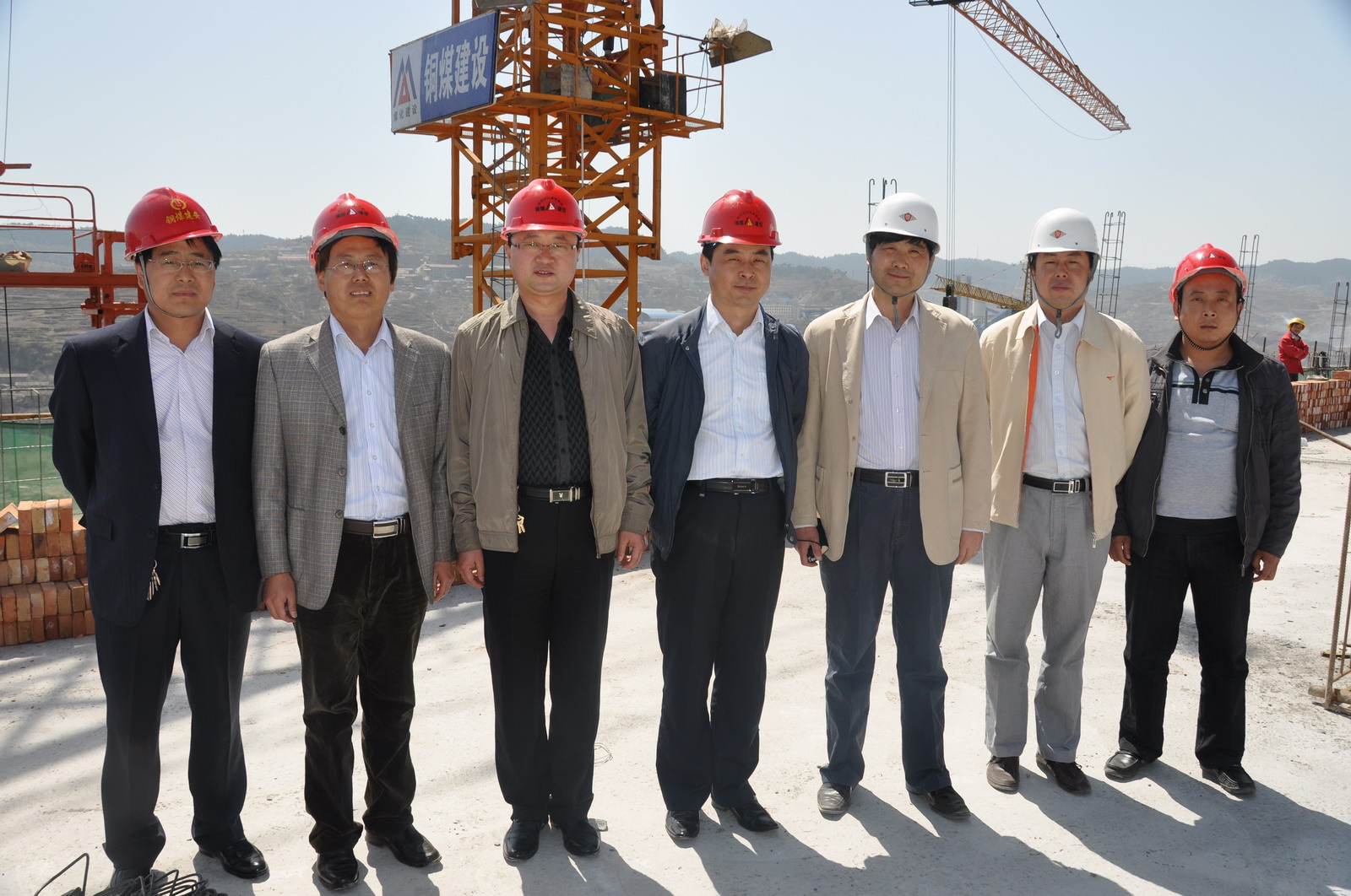 圖為1玉華礦黨委負責人唐建軍(中)、副礦長雷鐵山(左三)以及銅煤建設(shè)公司領(lǐng)導在1號公寓樓樓頂參加封頂合影。