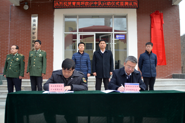10時左右,簽約儀式開始。首先,救護(hù)大隊大隊長劉平治受公司委托與青崗坪礦業(yè)公司簽訂了《礦山救護(hù)服務(wù)合同書》。 隨后,青崗坪礦業(yè)公司總經(jīng)理齊紅軍作了熱情洋溢的致辭。在致辭中,齊紅軍簡要介紹青崗坪礦業(yè)公司的基本情況,對銅川礦業(yè)公司和公司救護(hù)大隊對青崗坪礦業(yè)公司應(yīng)急救援體系建設(shè)的大力支持表示感謝,希望救護(hù)中隊以高度的政治擔(dān)當(dāng)和責(zé)任意識,加強訓(xùn)練,真抓實干,不斷推進(jìn)青崗坪礦業(yè)公司安全發(fā)展不斷邁上新臺階。救護(hù)大隊大隊長劉平治代表礦業(yè)公司講話中,介紹了救護(hù)大隊隊伍建設(shè)情況和取得的成就。要求全體駐礦指戰(zhàn)員,一是要牢記服務(wù)安全生產(chǎn)的宗旨使命,嚴(yán)明紀(jì)律、嚴(yán)格訓(xùn)練、嚴(yán)格管理、嚴(yán)格要求,服從命令、聽從指揮,弘揚隊伍光榮傳統(tǒng)和優(yōu)良作風(fēng)。二是要嚴(yán)格做好應(yīng)急值守工作,加強戰(zhàn)備值班和裝備車輛運行維護(hù),做到召之即來,戰(zhàn)之必勝。三是要積極融入礦區(qū)安全工作,遵守礦區(qū)規(guī)章制度,服從礦方統(tǒng)一管理,深入了解礦井安全生產(chǎn)、應(yīng)急建設(shè)等情況。四是要找準(zhǔn)定位、明確職能,認(rèn)真履行職責(zé),做好維護(hù)礦井安全生產(chǎn)的忠誠衛(wèi)士。同時,也希望青崗坪煤礦大力支持駐礦中隊工作,加強雙方溝通協(xié)調(diào),確保工作銜接,為駐礦中隊發(fā)揮職能作用提供必要保障。