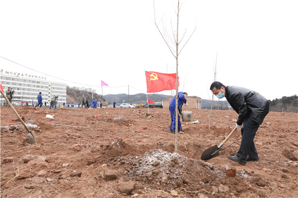 當(dāng)日下午14時,礦黨政帶領(lǐng)黨員干部和職工群眾扛著鐵鍬,拎著水桶,熱情洋溢的來到各自區(qū)域開展植樹活動。植樹現(xiàn)場,黨旗迎風(fēng)招展,大家分工協(xié)作,挖坑、施肥、栽樹、夯土、澆水,精心栽下一棵棵幼苗。建設(shè)自己的生態(tài)家園,每道工序都細(xì)致認(rèn)真,每名參與者都熱情高漲。迎著陽光揮汗如雨,一下午的繁忙勞動后,紅楓、銀杏、海棠、竹子、月季等近千株樹苗花苗迎風(fēng)挺立,為春天到來添了一抹韻味,讓綠色成為礦區(qū)最美底色。