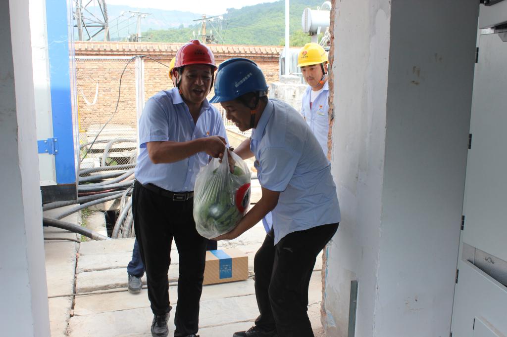 在下石節(jié)35KV無人值守變電站施工現(xiàn)場,該公司領(lǐng)導(dǎo)對正在頂著烈日施工的建設(shè)者和電氣試驗工程技術(shù)人員進(jìn)行了慰問,為大家送去了西瓜、綠豆、茶葉、真硒水、風(fēng)油精、藿香正氣水、蚊香等防暑降溫和防蚊蟲叮咬用品,并實地查看了工程進(jìn)展和現(xiàn)場安全措施落實情況以及施工人員日常生活情況,叮囑大家在緊張工作的同時,一定要注意安全。