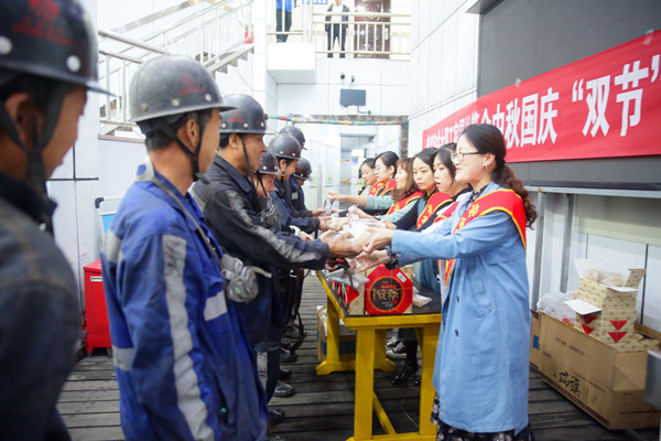 10月1日,在國慶、中秋“雙節(jié)”當(dāng)日,柴家溝井工會(huì)女工家屬協(xié)管會(huì)組織女工協(xié)管員,在井口開展了“同喜同賀家家團(tuán)圓、同歡同樂人人平安”雙節(jié)井口慰問活動(dòng),為一線職工送上節(jié)日問候和溫暖祝福。