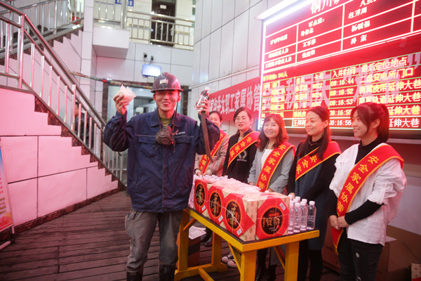 活動(dòng)現(xiàn)場(chǎng), 6名女工協(xié)管員帶上精心準(zhǔn)備的月餅、真硒水等慰問品來到井口人車等候室,為出入井的礦工們送上節(jié)日祝福和安全囑托。女工協(xié)管員們一邊把象征團(tuán)圓的月餅遞到準(zhǔn)備下井和剛剛升井的職工們的手中, 一邊叮囑著: “中秋節(jié)快樂,吃塊月餅吧!”“師傅您辛苦了,吃塊月餅再下井,您下井一定要注意安全?!?/p>