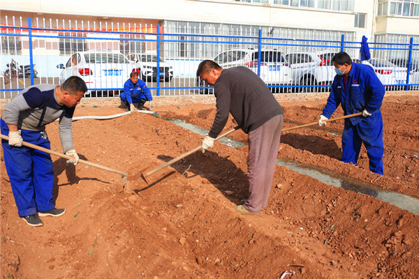 3月1日,晨光初照,春風微寒。走進玉華礦北風井生活區(qū),空氣中彌漫著新番泥土的氣味。在礦井自建的菜園子里,物業(yè)公司職工及食堂工作人員將濕潤松軟的土壤翻起,鋪設疏通水管,揮動鋤頭為剛剛播種的幼苗引水施肥,一派緊張忙碌的農(nóng)耕景象已然成為百里礦區(qū)最美的春耕圖。