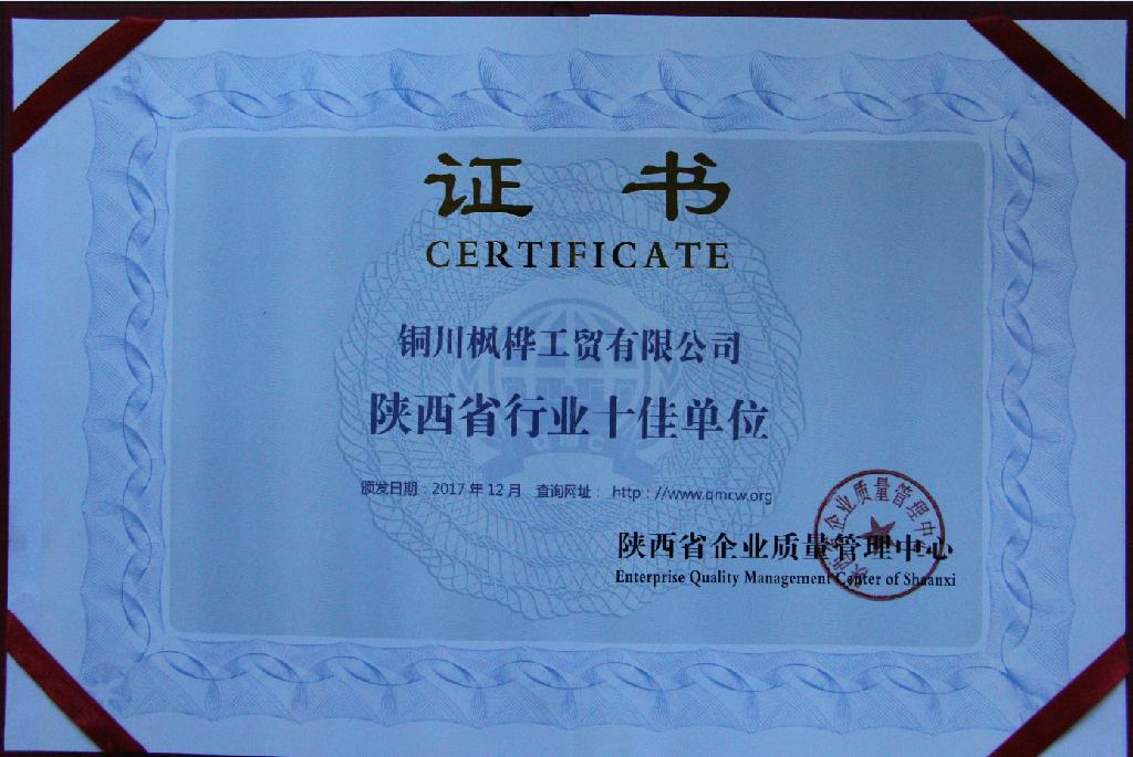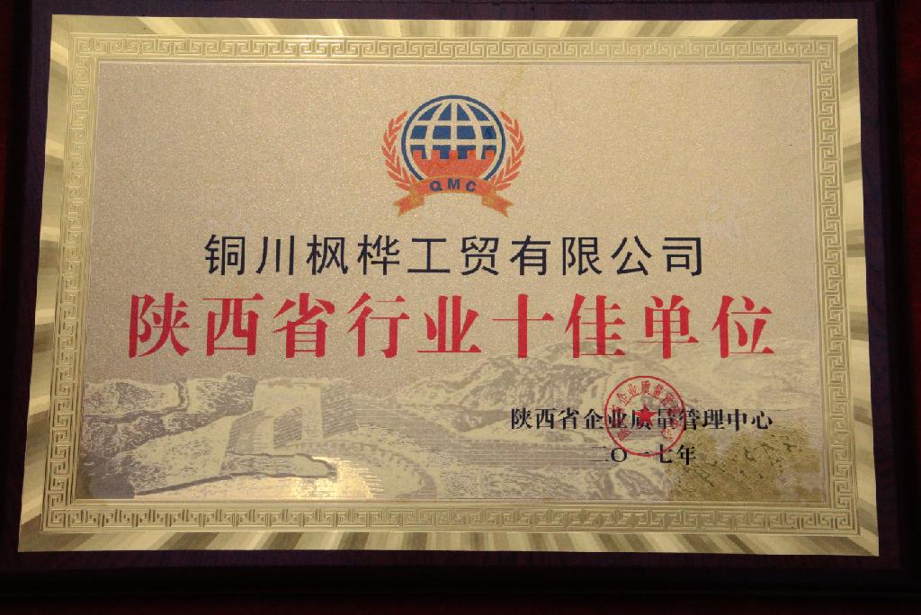 近日,從陜西省企業(yè)質(zhì)量管理中心傳來喜訊,奧博集團銅川楓樺工貿(mào)公司喜獲2017年“陜西省行業(yè)十佳單位”榮譽稱號。